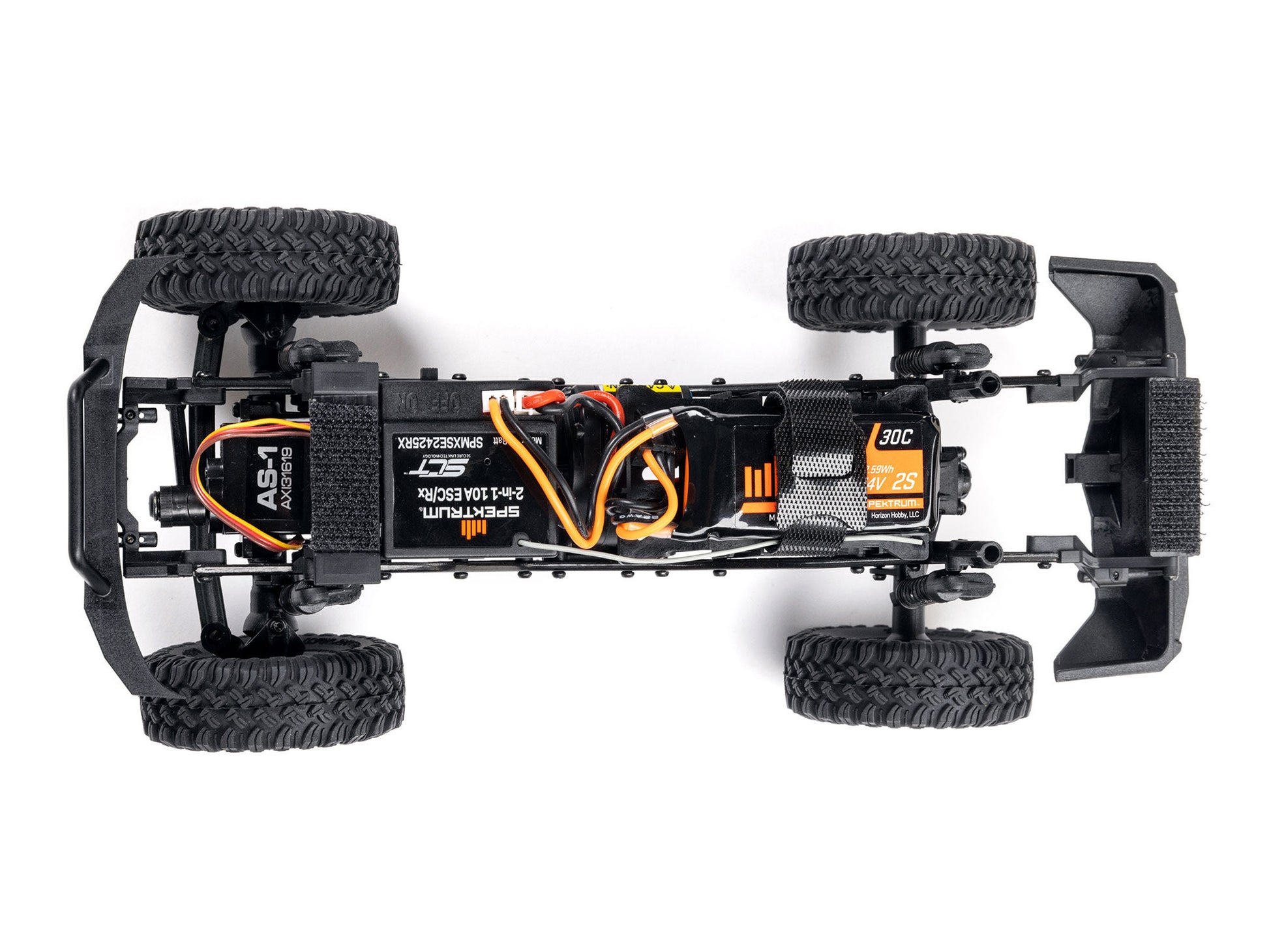One of the most successful micro platforms of all time, the Axial SCX24 is also one of the best values in the RC crawling hobby. Inside the box, along with the assembled and finished rig, you'll find a Spektrum SLT2 2.4GHz transmitter, 350mAh LiPo battery, and handy USB charger. Even the AA transmitter batteries are included. For big adventures in micro RC crawling - at a small price - come to the SCX24 Base Camp!
