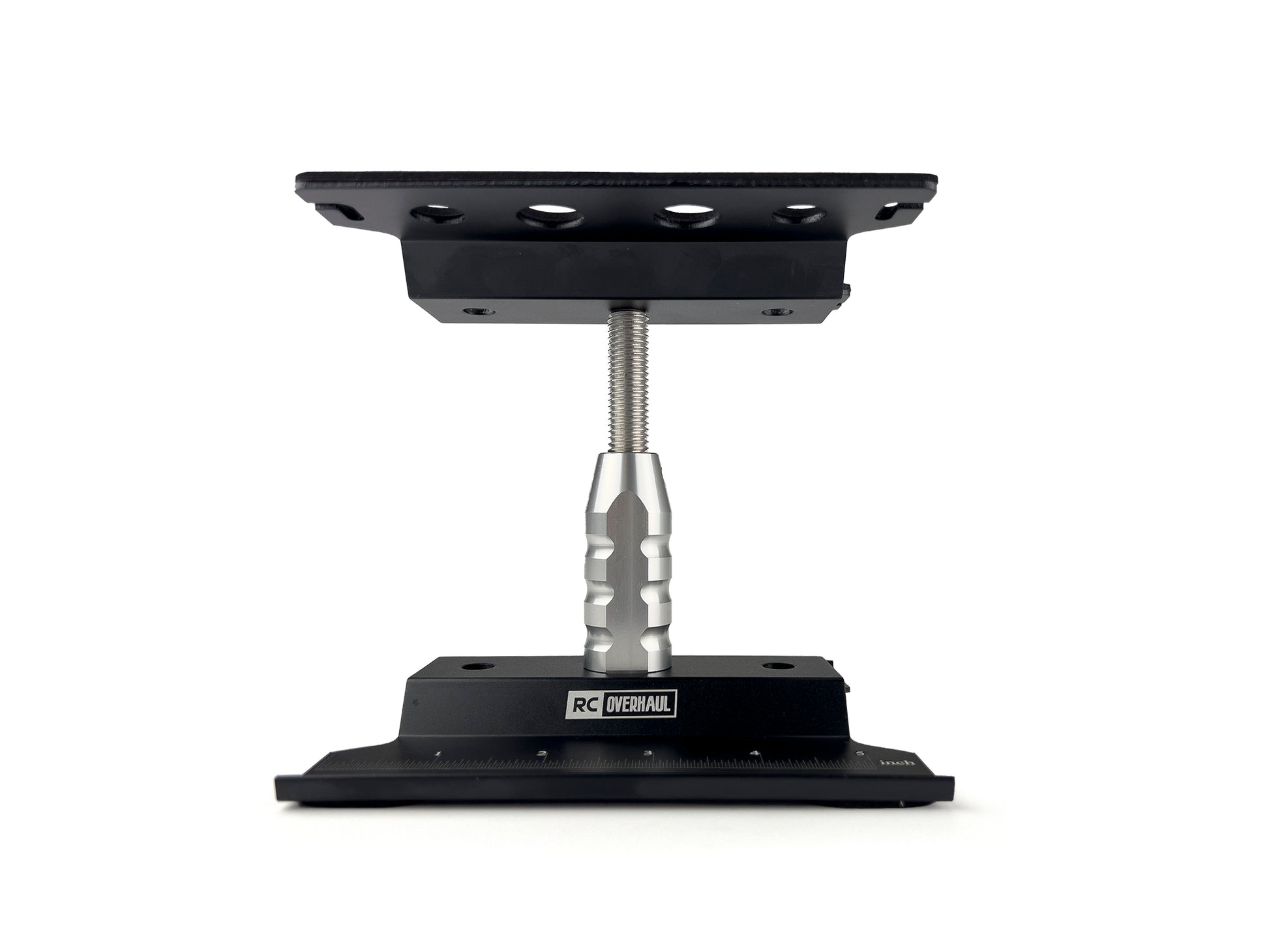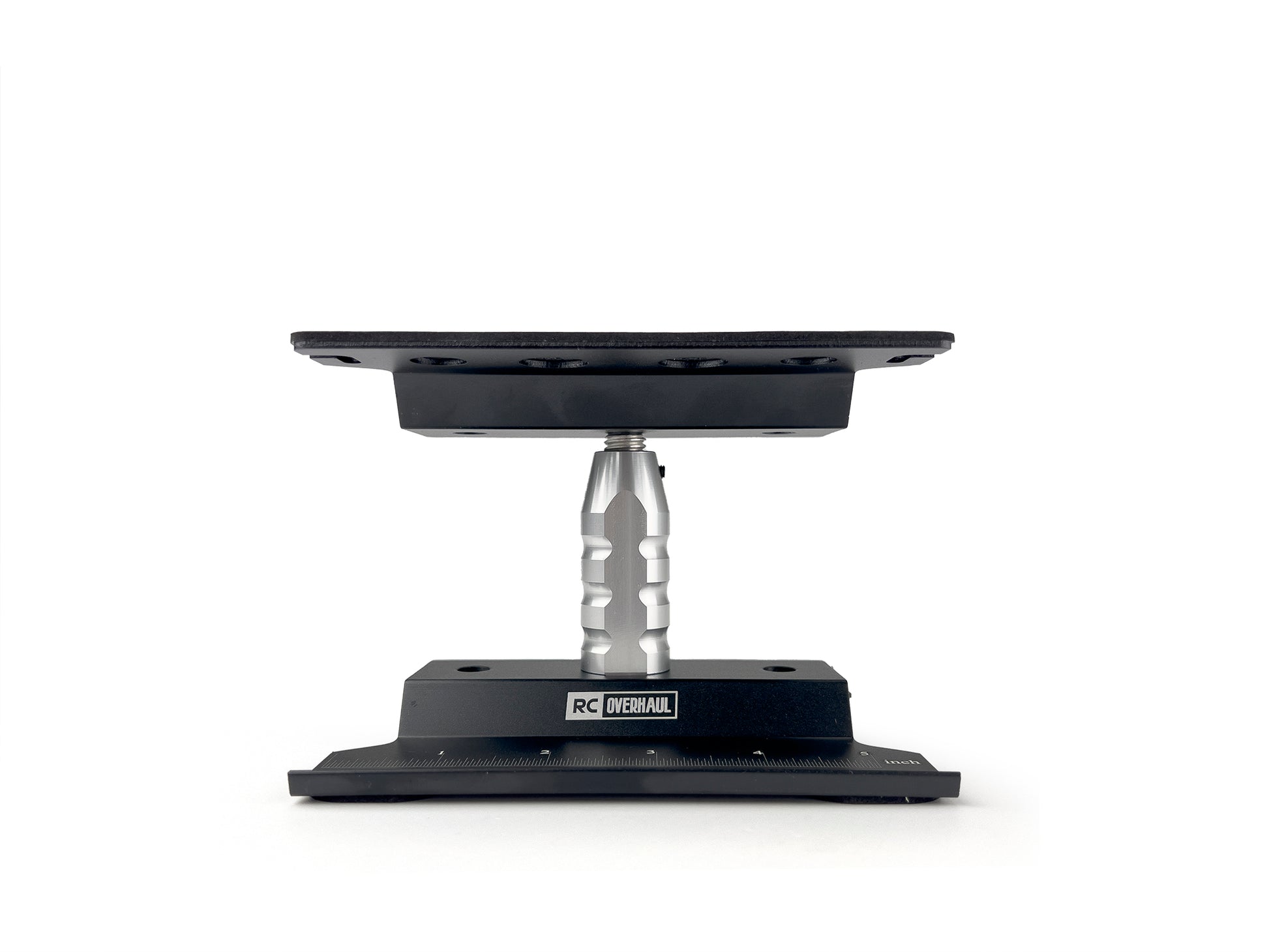 Made from folded aluminium and with a chucky centre column it makes for a sturdy stand that will happily hold your 1/18th scale GROM or your 1/8th TLR buggy! Foam pads are provided for the upper plate that helps to grip the car when working on it and prevents it slipping off; whilst 4 smaller pads are included for the bottom of the base to prevent the stand slipping on any hard surface. Anodized black and finished off with the 'RC Overhaul' logo laser etched on the base, this swivel car stand make working on your vehicle that little bit easier!