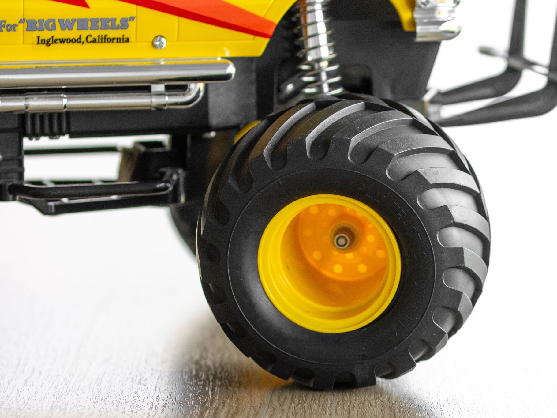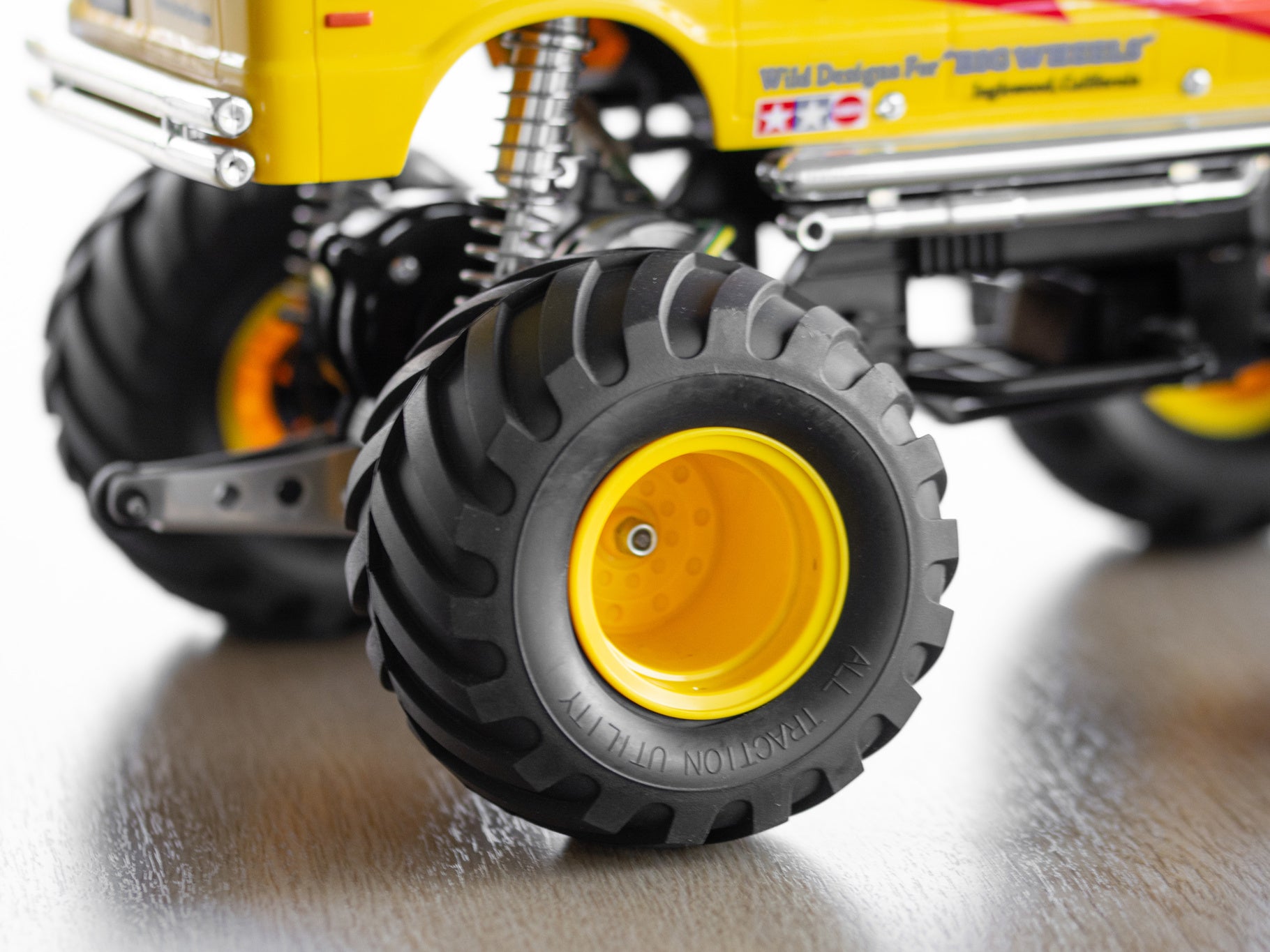 The durable and easy-to-assemble 2WD chassis employs a box type frame, and features front independent swingarms and a rear rolling rigid suspension. Big 115mm diameter tyres offer dynamic running on even the toughest of surfaces. A sealed gearbox protects the diff gear from dirt and sand during off-road driving. Rear mounted wheelie bar enables wild stunt driving.